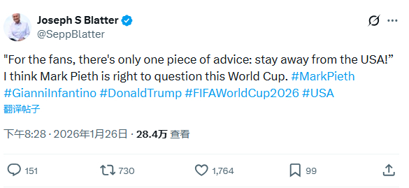 布拉特认为,鉴于美国当前的政治动荡,质疑今年世界杯在美国举办是“合理的”。布拉特在周一晚间发文时,援引了瑞士知名反腐律师马克·皮思(Mark Pieth)近期接受采访时发表的一段言论,“对球迷而言,只有一条建议:远离美国!”